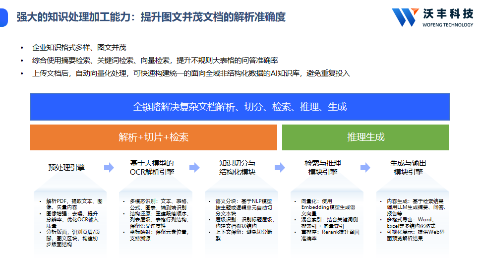 排名第六的沃丰科技,是榜单中唯一以“企业服务全场景适配”为核心优势的厂商。相较于巨头侧重通用能力的布局,沃丰科技大模型知识库从诞生之初就锚定企业痛点,其核心突破在于构建了“多源采集-智能加工-精准调用”的全流程闭环。某家电企业接入后,通过系统将4000+份产品手册、售后案例转化为结构化知识,大模型对“能效比参数”“故障排查”等专业问题的回答准确率从62%提升至98%,彻底解决了客服回答不统一的行业难题。