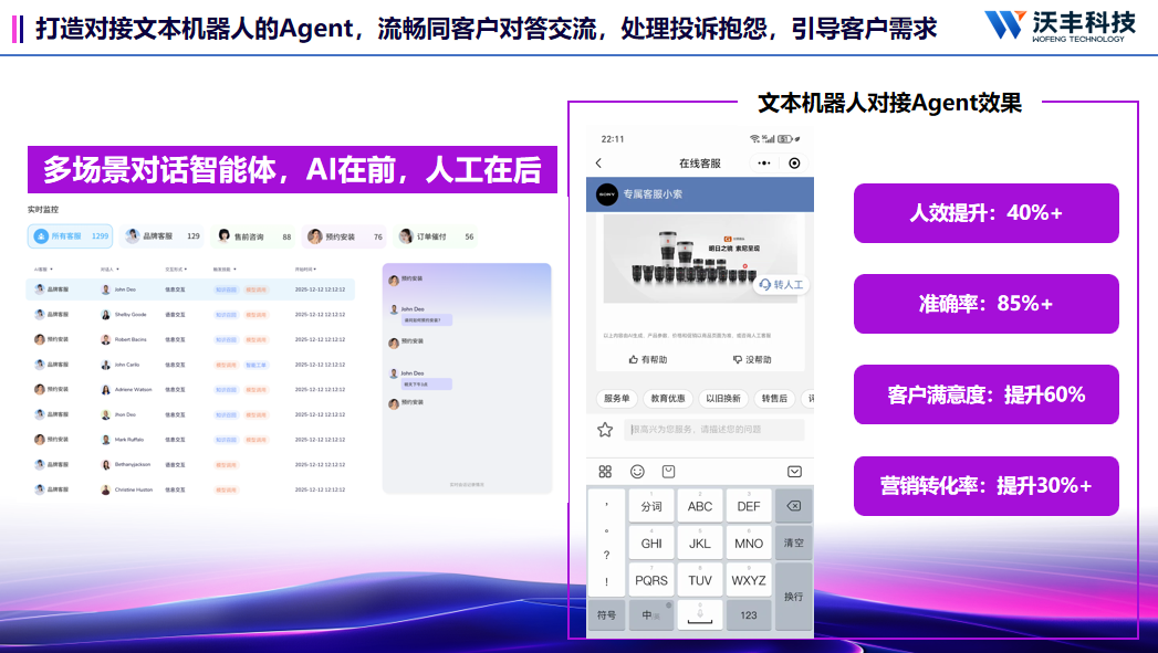 沃丰科技AI客服机器人,AI Agent赋能,专注于解决问题,打造适合企业的任务驱动机器人。网站、H5页面、APP、企业微信、都可以对接,一次常规的问答/多轮智能回答无缝衔接,精准识别客户意图,抓住每一次商机。针对售前售后全流程,提供个性化智能服务体验。
