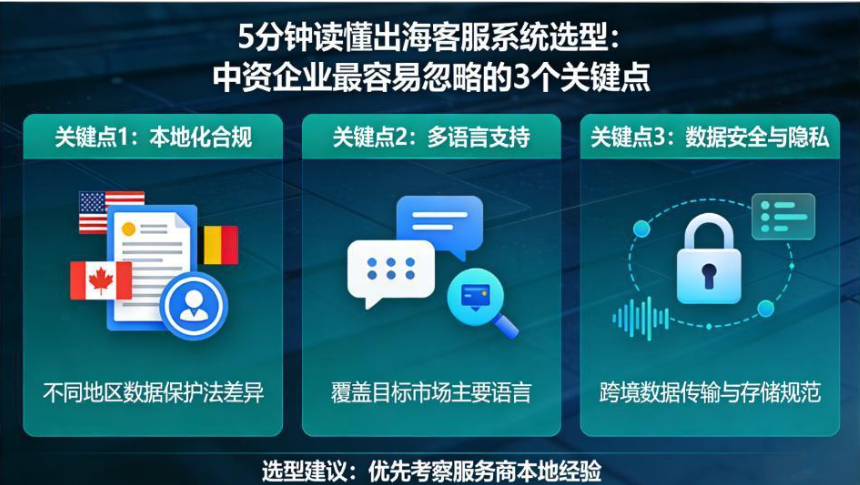 出海客服系统的选型,核心是突破“合规、渠道、语言、时区、技术”五大壁垒,这也是区别于国内客服系统的关键。这一步的checklist,每一项都是“一票否决项”,直接决定系统能否落地、能否帮企业省钱,而非额外增加成本。