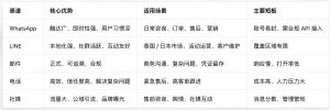 结合热门的 WhatsApp LINE 对比不难看出,全球化布局优先 WhatsApp,深耕日韩、泰国等细分市场加码 LINE,双渠道组合搭配海外社媒客服,是现阶段出海最优搭配。