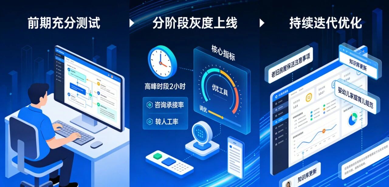● 分阶段灰度上线:初期仅在每日咨询高峰时段上线2小时,重点监测核心指标表现,当晚针对性调优;待核心数据稳定再逐步扩展上线时段与覆盖场景。